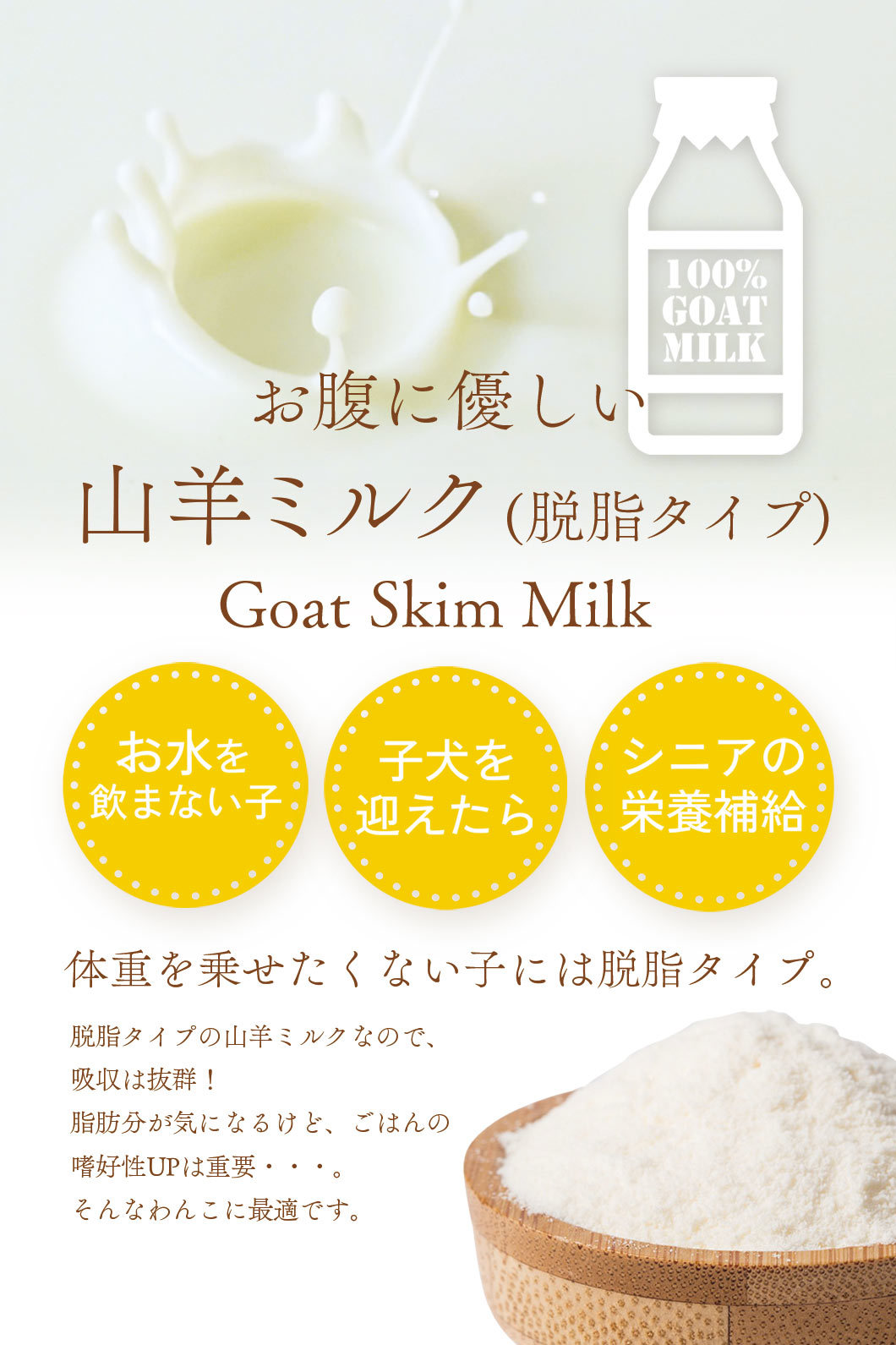 脱脂タイプの山羊ミルクなので吸収は抜群!
