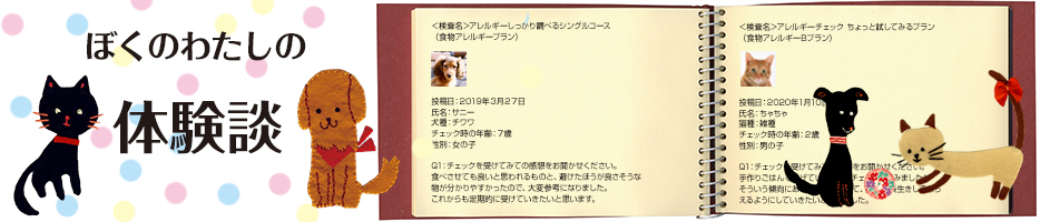 - たびたび下痢や嘔吐をしていましたが原因がわかりませんでしたがアレルギーチェックで調べた結果をもとに、アレルギー原因のものが一切入っていないフードやおやつにしたところ、検査後4カ月になりますがピタッととまりました。動物病院で体毛でチェックしたことを話すと医師は受け入れられない様子でしたが、良くなったことは事実ですので飼い主としては信頼し感謝しています。有難うございました。